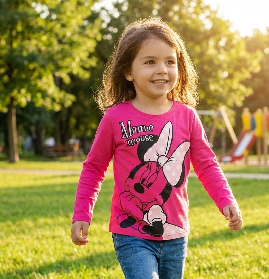 The Minnie Mouse girls long sleeve T-shirt pairs easily with jeans, leggings, skirts, or shorts. Consequently, it works well for school days, family outings, or relaxed weekends at home.