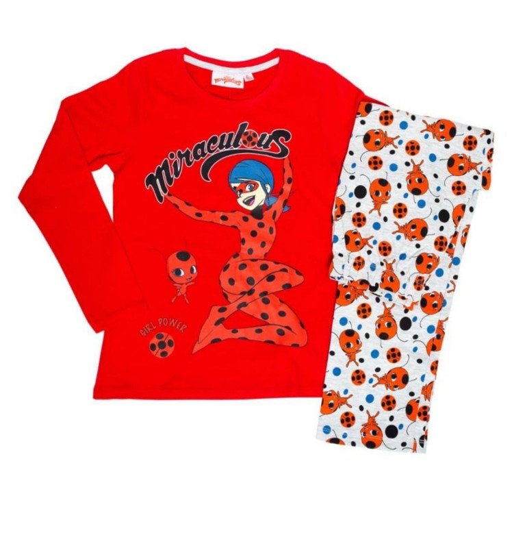 “Miraculous Ladybug girls’ long sleeve 100% cotton pyjama set made in [Country], featuring Ladybug graphic top and matching trousers.”